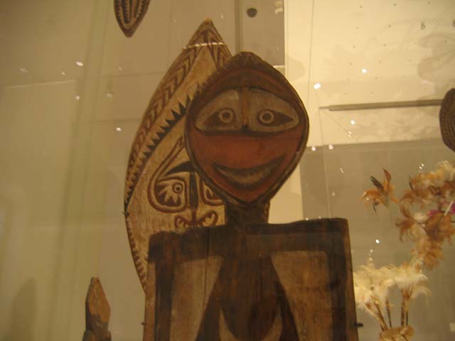 11/16 We thought this was a cute-looking thing; it is a late 19th/early 20th century Hohao, or spirit board, from the Gulf of Papua. The figure on this carved and painted board depicts a forest spirit known to the Elema people, who live on the long coast of Orokolo Bay in southern Papua New Guinea. (Room 24, Living and Dying)